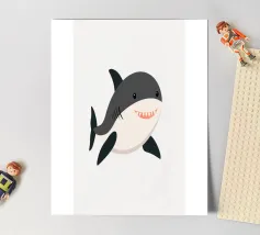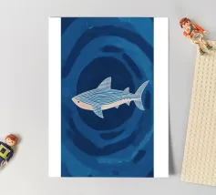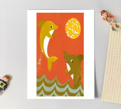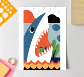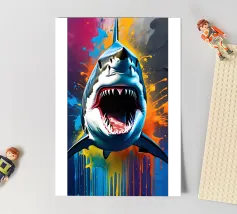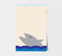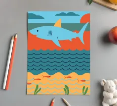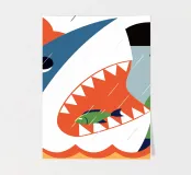 Enjoy a vibrant ocean illustration featuring a shark attacking a fish in the sea with rain and clouds in the background.