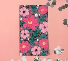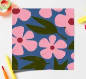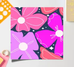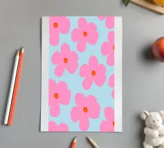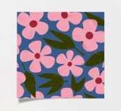 A seamless pattern of stylized pink flowers with yellow centers on a solid dark blue background. The simple, bold forms create a classic and cheerful floral design with a modern, graphic appeal.