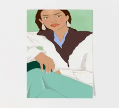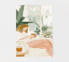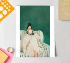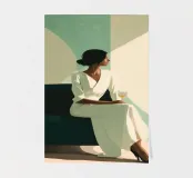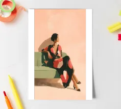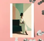 Blending mid-century tones and modern grace, this piece explores the intersection of shape and solitude. The soft color palette and bold geometry echo the woman’s tranquil presence, crafting a composition that feels like visual jazz—sophisticated and effortless.