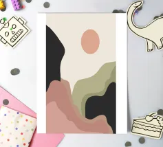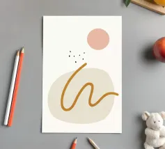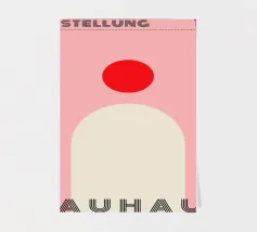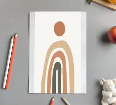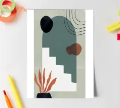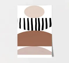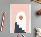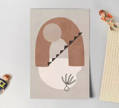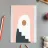 An abstract composition features geometric shapes, including a black staircase pattern ascending through a white arch against a soft pink background. A solid brown circle is positioned near the top, adding a focal point to the minimalist design.
