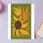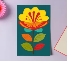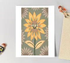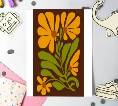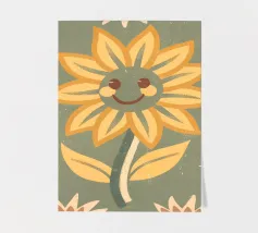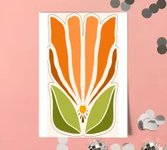Bright yellow and orange abstract forms resembling a sunflower. Curved shapes and small lines add a dynamic sense of movement to the composition.