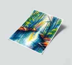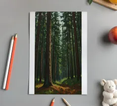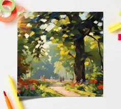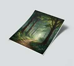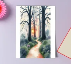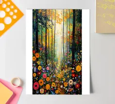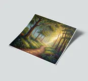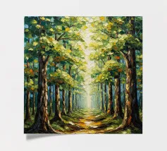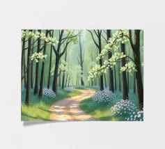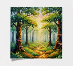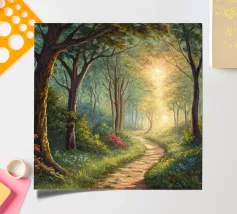 A painterly and serene landscape painting depicting a tranquil forest scene. A winding dirt path meanders through a sun-dappled woodland, leading the viewer's eye toward a brilliant shaft of light breaking through the canopy. The foreground is alive with a lush undergrowth of wildflowers in shades of purple, white, and blue, alongside vibrant green foliage. The towering trees with their textured bark create a sense of depth and scale, while the soft, hazy light filtering through the leaves evokes a feeling of peace and natural beauty. This piece combines realism with an impressionistic touch,
