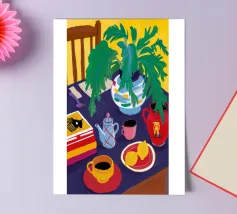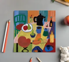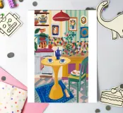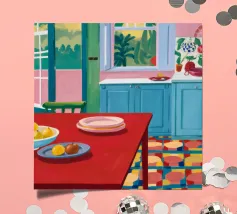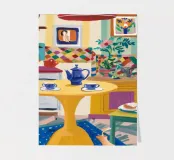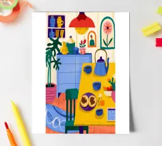 A vibrant patchwork kitchen with yellow table, tea set, and art bursts with domestic color.