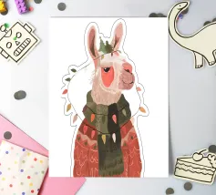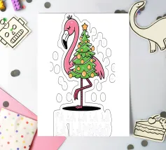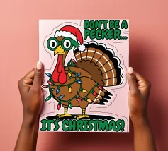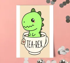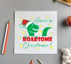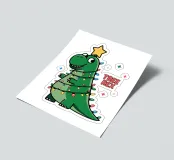 A cheerful green dinosaur is humorously decorated to resemble a Christmas tree, complete with colorful lights and a star on its head. The words "Tree Rex" are playfully written beside it, adding to the festive theme.