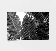 Black and white view from below of a forest of very tall trees.