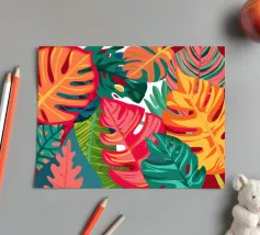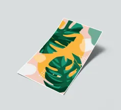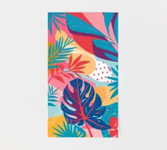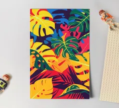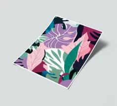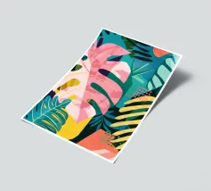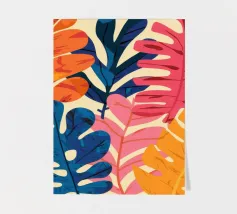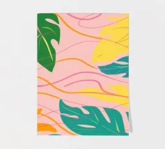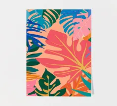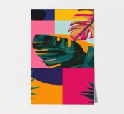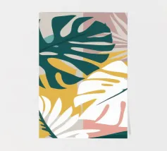 A sophisticated composition combines blocks of tropical leaf patterns with solid color fields and geometric shapes. The patchwork design in shades of blue, pink, and green creates a balanced and stylish piece that is both modern and natural.