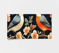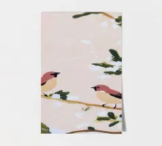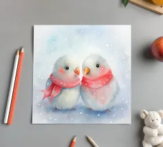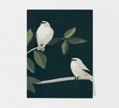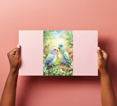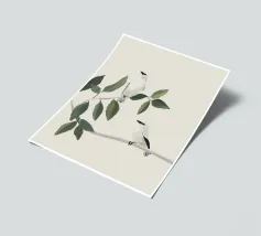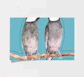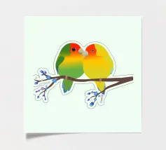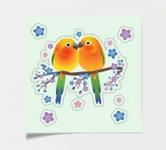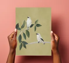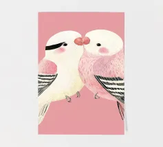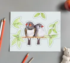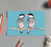 A watercolor drawing of two Java sparrows. They sit next to each other on a long stick and touch each other with the tips of their beaks.