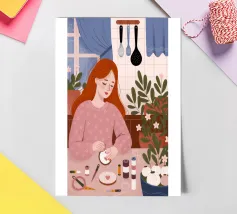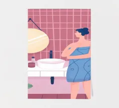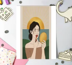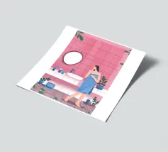 This artwork shows a person with blonde hair looking into a vanity mirror. The background is filled with floral wallpaper, and the vanity table is adorned with various items, creating a nostalgic and intimate scene.