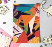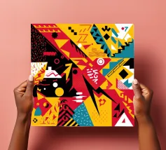 A dynamic and vibrant collage of different abstract patterns and textures, featuring stripes, speckles, and solid color blocks in a rich palette, creating an energetic and modern artwork.