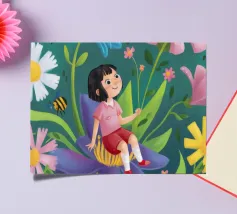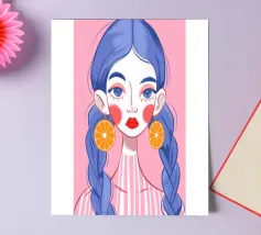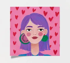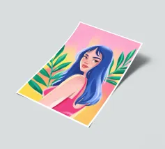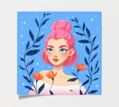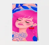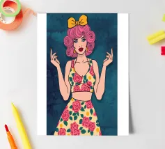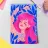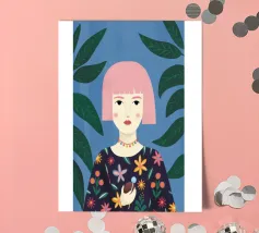 This artwork features a figure with pink hair, set against a background filled with blue and pink floral elements. The scene is vibrant and whimsical, full of playful energy.