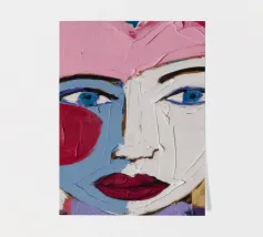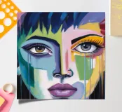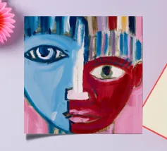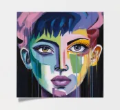 This artwork features a figure with vibrant colors, including purple, pink, and blue. The abstract nature of the painting creates a sense of vivid expression and emotion.