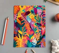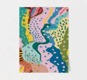 An abstract composition of flowing, wavy lines and organic shapes in a vibrant palette of green, pink, blue, and orange, creating a sense of joyful movement and rhythm.