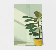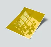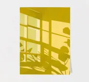 An abstract and minimalist composition focusing on the shadows of leaves cast by a window onto a bright yellow wall. The image is a beautiful and serene study of light, shadow, and form.