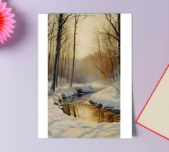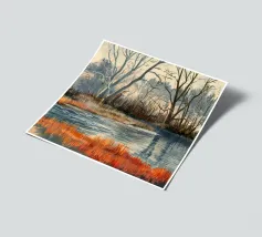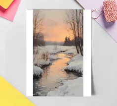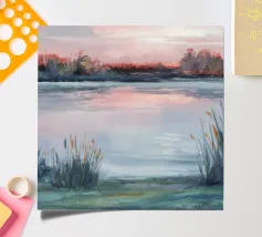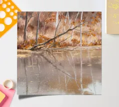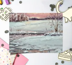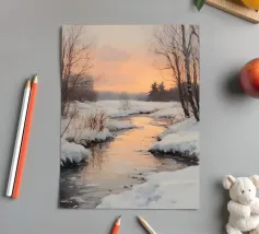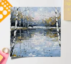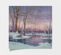Bare trees and pink skies reflect softly in a thawing winter pond, evoking serene cold beauty.