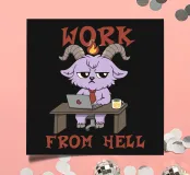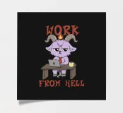 A purple demon goat in a tie sits at a desk with a laptop and coffee, under the phrase “Work From Hell.” The artwork makes a clever pun on daily work feeling like hell, with the demon literally working from hell. Ideal for fans of dark humor, sarcastic office jokes, and anyone who wants to laugh at work struggles.