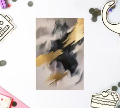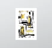 Modern abstract graphic design with a touch of elegance. Experimental vector painting with different brushes in black and white with golden highlights. Dynamic and very appealing contemporary design.