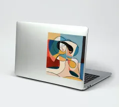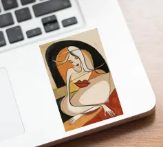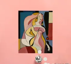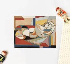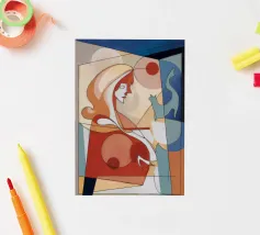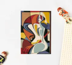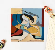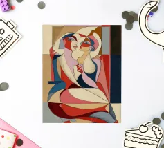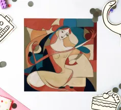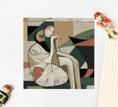 This artwork depicts an abstract figure in a seated pose, surrounded by geometric shapes and muted colors. The use of beige, brown, and black tones creates a sense of depth and complexity. The figure's posture and the abstract elements within the composition invite the viewer to reflect on the meaning and emotions conveyed by the artwork.