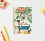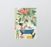 This image shows a person taking a bath in a tub surrounded by plants and a cat, with a cup and book nearby. The cozy and tranquil atmosphere makes it a comforting and pleasant scene.