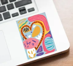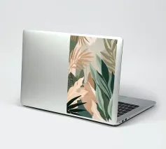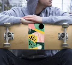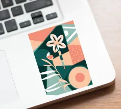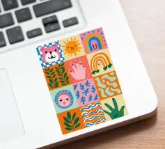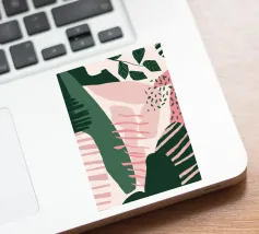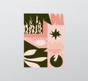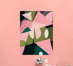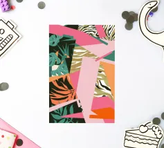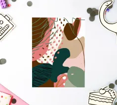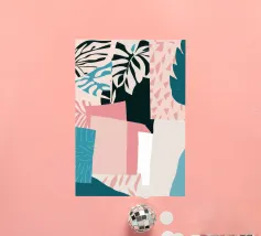 A modern, abstract composition featuring a patchwork of various patterns and shapes. Elements include organic leaf like forms, geometric grids, and abstract textures in a muted palette of pink, black, and beige, reflecting a bohemian, eclectic style.