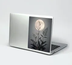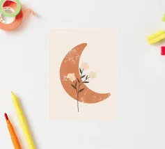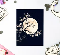 This captivating print features a full moon, bathed in a soft, golden glow, against a deep black backdrop. Two elegant, stylized flowers, one with dark, almost iridescent petals and the other with delicate, golden leaves, stand tall beneath the lunar orb. The interplay of light and dark, combined with the intricate details of the floral elements, creates a truly mesmerizing piece that will add a touch of celestial beauty to any space.