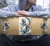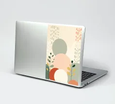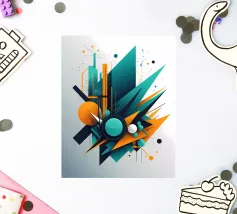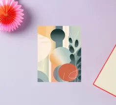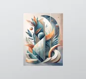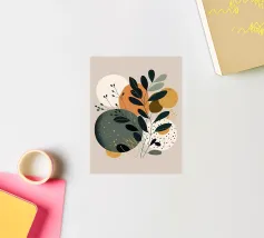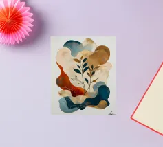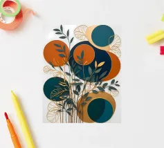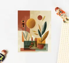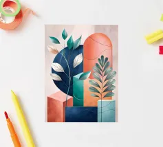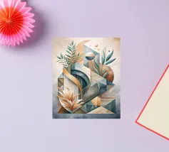 A captivating abstract artwork that blends organic and geometric elements. Lush foliage intertwines with celestial bodies and architectural forms, creating a sense of harmony and balance. The muted color palette and intricate details invite contemplation and exploration.