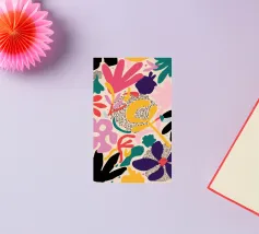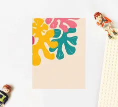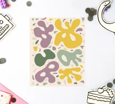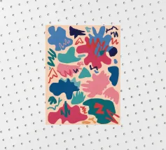 A vibrant and playful abstract pattern of interlocking, fluid shapes in a lively palette of pink, yellow, blue, and green. The composition is energetic and full of joyful, organic movement.