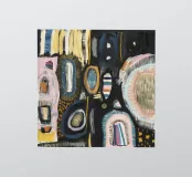 A complex weave of U-shapes, varied line work, and organic elements in pinks, yellows, white, and teal against a dark background creates a mysterious, pattern-based tapestry.
