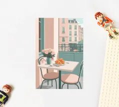 An illustration of a dining table with chairs, with strong, long shadows cast from a nearby window. The composition is a moody, atmospheric, and artistic study of light and domestic space.