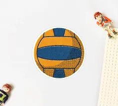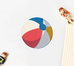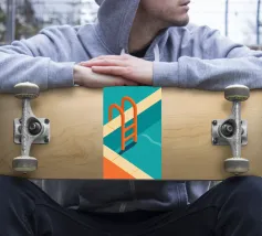 A modern, abstract depiction of a swimming pool with green checkered tiles. A red ball floats on the water, creating a sense of a quiet, sun drenched moment of leisure.