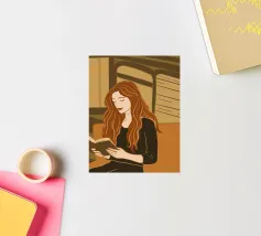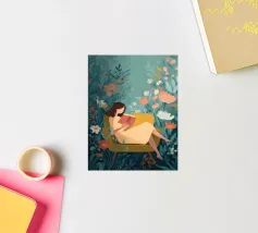 A person sits on the grass in a serene forest, engrossed in a book. Warm golden light filters through the trees, creating a magical and tranquil atmosphere.