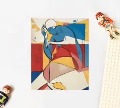 This painting showcases abstract figures in vibrant colors, including red, yellow, and purple. The composition is lively and full of energy.