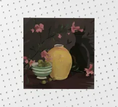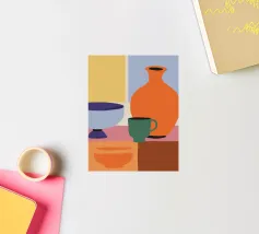 A vibrant still life displays a collection of colorful vases (purple, blue, striped), bowls, and decorative objects artfully arranged on a bright yellow tabletop against a pink and green segmented wall.