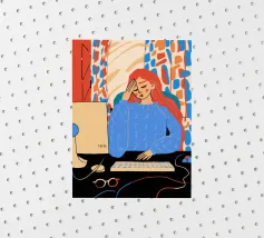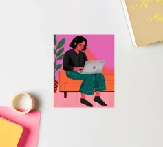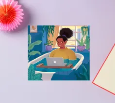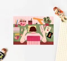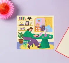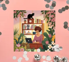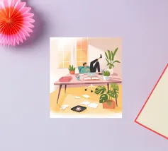 A person works on a laptop surrounded by books, papers, and decorative elements. Plants and a warm ambiance enhance the productive environment.