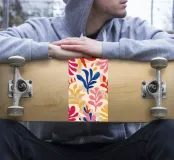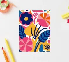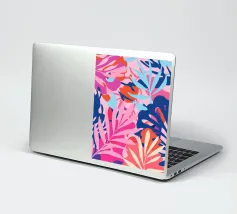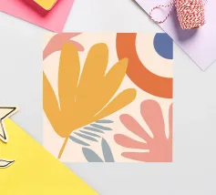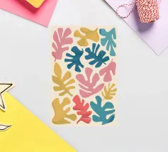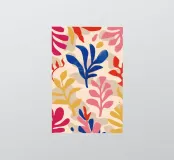A vibrant, seamless pattern of stylized leaves and botanical shapes in a palette of red, blue, pink, and yellow, creating a sense of rhythmic, natural movement.