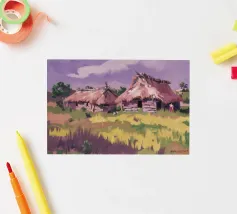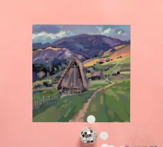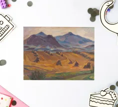 A serene landscape centered on a well-formed haystack standing in a field characterized by gently rolling hills in muted shades of purple and green, all under a soft, calm sky.