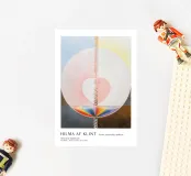 This captivating exhibition poster features a profound abstract artwork by Hilma af Klint, "The Tree of Knowledge, No. 5," characterized by its ethereal spirals, concentric circles, and delicate rainbow spectrum. The soft pastel shades of pink, yellow, blue, and brown blend seamlessly, creating a sense of spiritual depth and cosmic harmony. The poster advertises the "Hilma af Klint - Artist, researcher, medium" exhibition at the Museum of Modern Art, Stockholm, from 16 February 1977 to 26 May 1977. This high-quality digital poster (7000x5000 pixels, 300 dpi) beautifully captures the mystical a