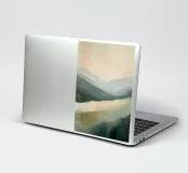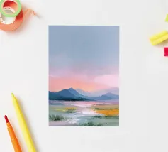 Ein minimalistisches Ölgemälde mit einer Impasto-Technik und kräftigen Pinselstrichen, das grüne Berge vor einem hellgelben Himmel zeigt. Ein weißer Fluss fließt durch das Tal, wobei die neutrale Farbpalette einen beruhigenden Effekt erzeugt. Die entfernten Hügel sind weich gezeichnet und zeigen einen modernen Kunststil mit abstrakten Formen und Linien. Die Gesamtkomposition ist harmonisch, und die weiche Beleuchtung unterstreicht die Szene.