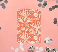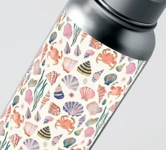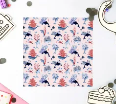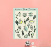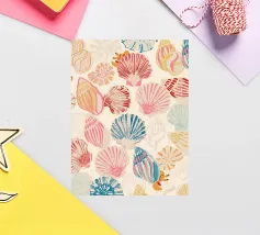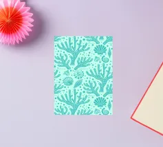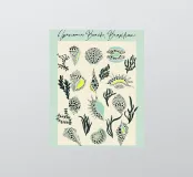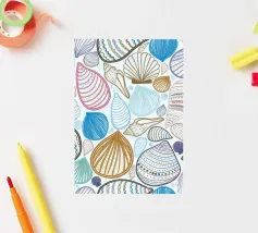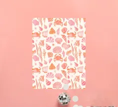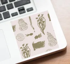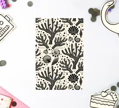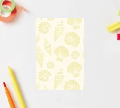 This artistic coastal design features abstract shell, coral, and sea plant shapes arranged in a balanced, modern composition. Delicate dot patterns add texture and depth, while organic silhouettes create a calm, natural rhythm. The soft color palette combines cream, muted green, deep blue, black, and subtle yellow accents for a timeless maritime aesthetic. A stylish, nature-inspired illustration with a contemporary coastal feel, ideal for lovers of minimalist, elegant art with marine motifs.