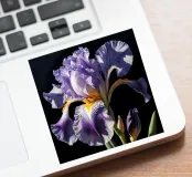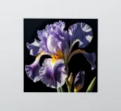 A stunning bearded iris in full bloom, captured in a close-up view against a dark background. The intricate details of the flower's ruffled petals, vibrant colors, and contrasting textures are beautifully highlighted. This exquisite artwork celebrates the beauty and elegance of nature's creations.
