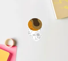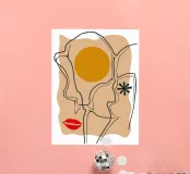 A continuous line drawing creates an abstract face with red lips and a star, overlapping with a sun shape on a textured background, blending minimalism and surrealism.