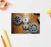 Gear of moving mechanical cogwheels fixed on a wooden panel.