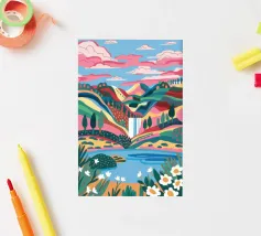 An expressive and vibrant landscape painting of rolling, patchworklike fields in shades of green, yellow, and pink. The painterly style captures the dynamic beauty and texture of the countryside.