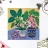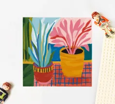 Several potted plants with vibrant flowers and leaves, in uniquely patterned pots, arranged on a surface with a patterned cloth, creating a rich textural and colorful display.