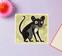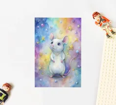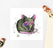 A spotty watercolor drawing of a black rat. Grunge dripping style. He has big purple eyes. He looks at you in bewilderment.