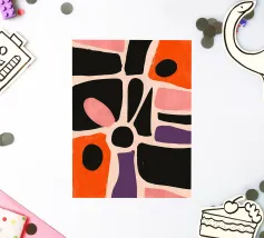A dynamic abstract composition features bold, rhythmic shapes, spirals, and patterns in a vibrant palette of reds, pinks, blues, and black, creating an energetic and visually stimulating piece.