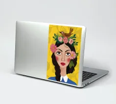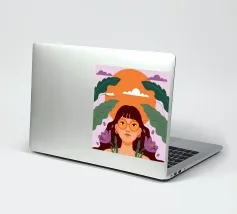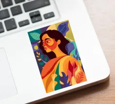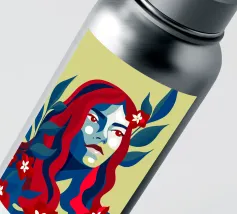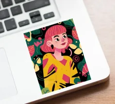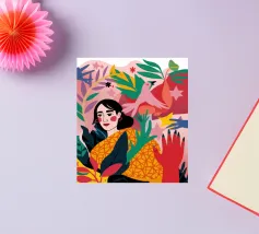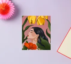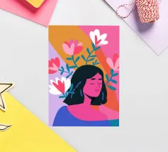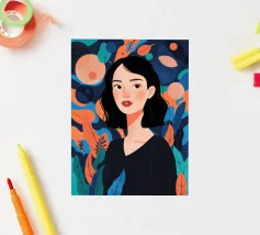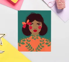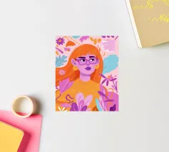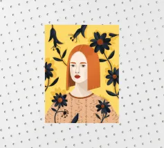 A portrait of a woman with flowing red hair, surrounded by stylized leaves and flowers, looking thoughtfully to the side. The style is modern, bold, and slightly art nouveau.