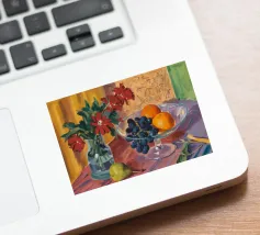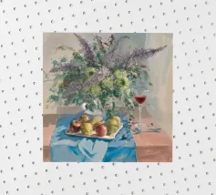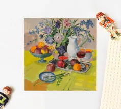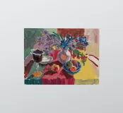 A lavish still life painting features a silver teapot, a cup of tea, a bowl of fruit including apples and berries, and a vibrant bouquet of flowers, all richly colored and textured, on a table.