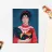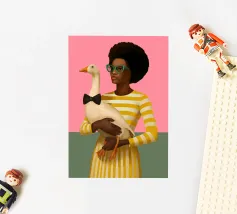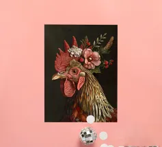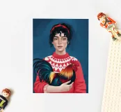 This artwork shows a person in a red sweater holding a rooster. The background is dark, highlighting the rustic and charming elements of the scene.