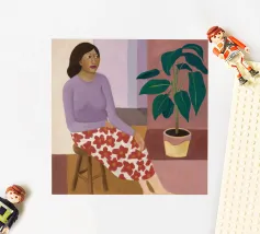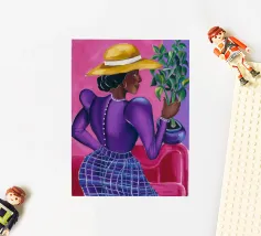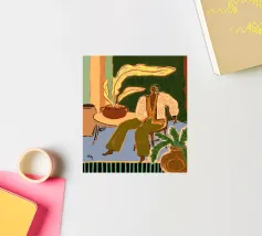 This artwork shows a person sitting on a striped chair, surrounded by sunflowers and a green bag. The background is a muted brown, creating a rustic and reflective atmosphere.