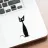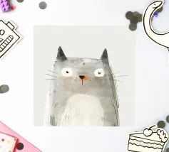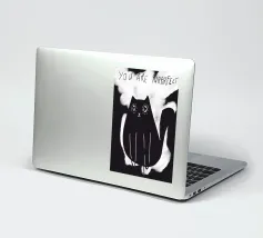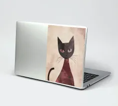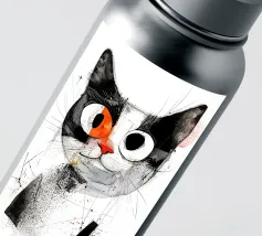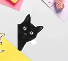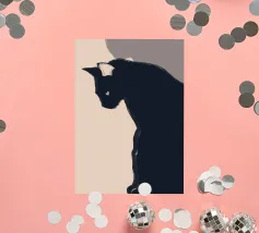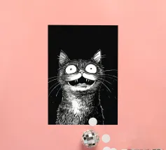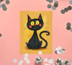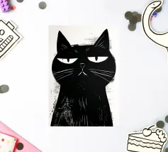 A minimalist black-and-white illustration of a sleek, black cat with exaggerated wide eyes and sketchy features. The cat's whimsical and abstract design adds a playful, artistic touch.